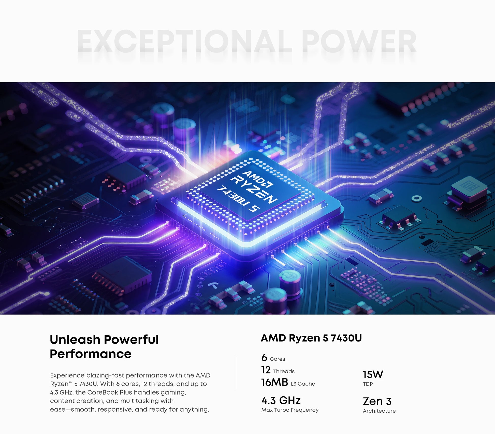 Experience blazing-fast performance with the AMD Ryzen R5 7430U. With 6 cores.12 threads. and up to 4.3 GHz. the CoreBook Plus handles gaming,content creation,and multitasking with ease-smooth,responsive, and ready for anything