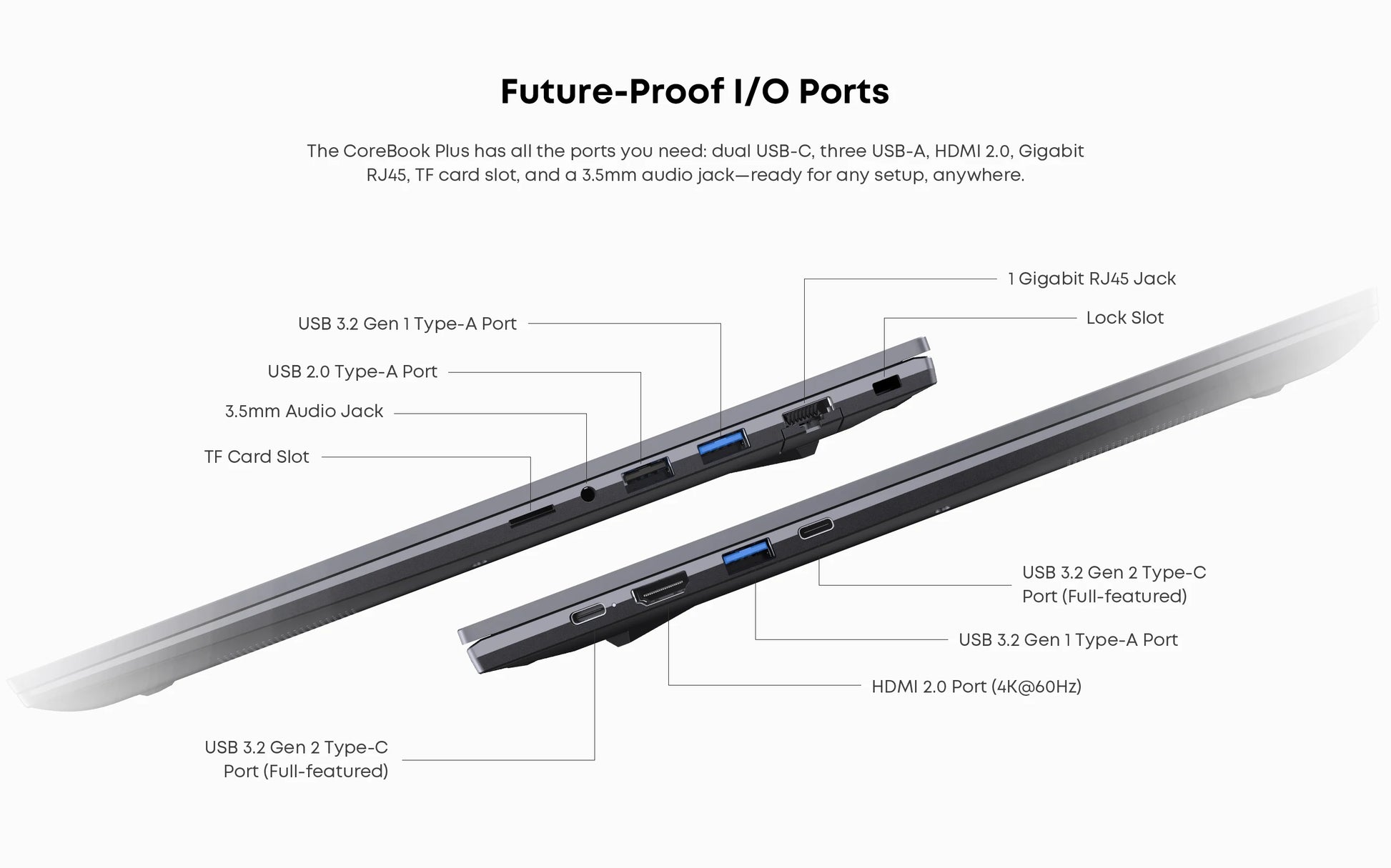 Featuring dual so-DlMM and dual M.2 Pcle slots, the CoreBook Plus supports up to 64GBRAM and 2TB storage-delivering unbeatable speed, seamless multitasking, and space foral your digital needs.